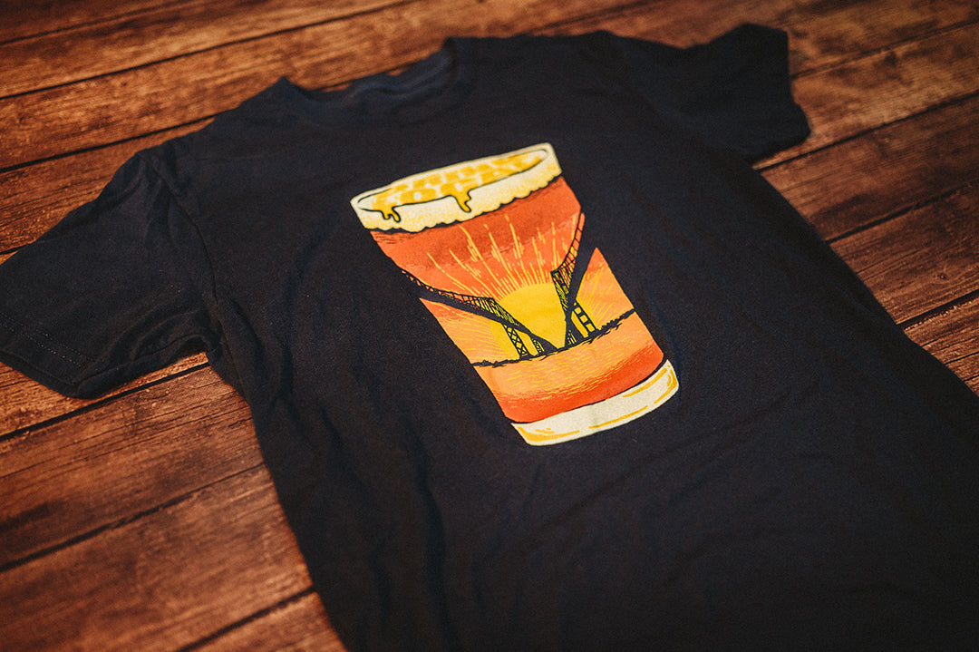 Beautiful image of the sun rising between the 2 spans of the Bay Bridge Inside a pint glass. Drink it all in! 100% cotton tee.