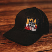 Black snapback trucker cap with our Drink Local patch riveted to the front.