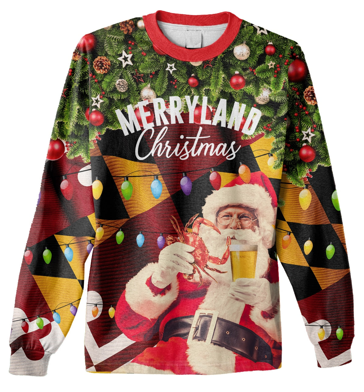 This Maryland themed ugly holiday sweater features Santa enjoying a classic Maryland combo... Crabs and Beer! I feel bad for the kids waiting for him to deliver presents after this house. I am sure they were covered in old bay.