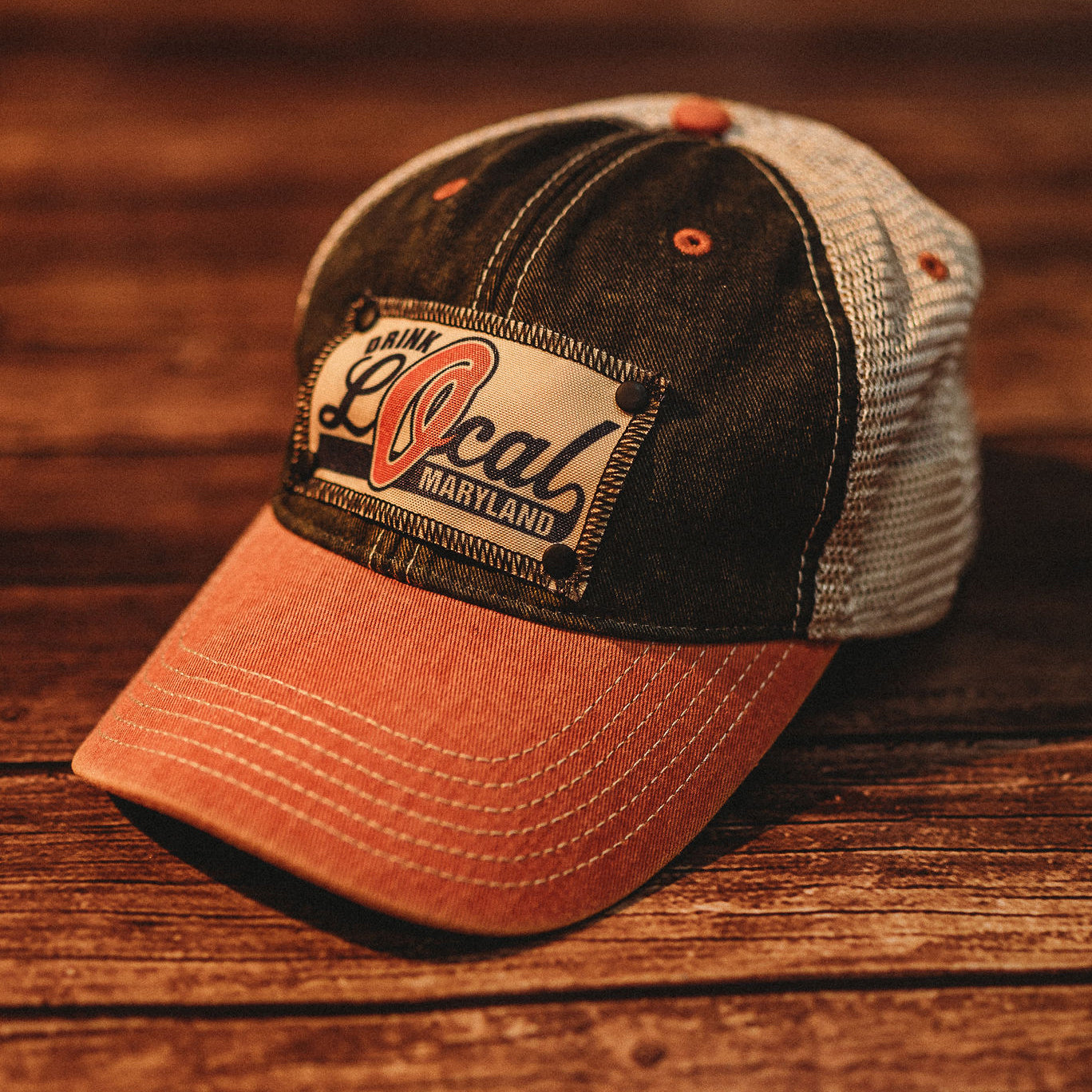 Vintage look orange and black baseball cap with Drink Local MD patch.