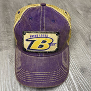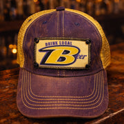 Purple hat with the letter B on it.